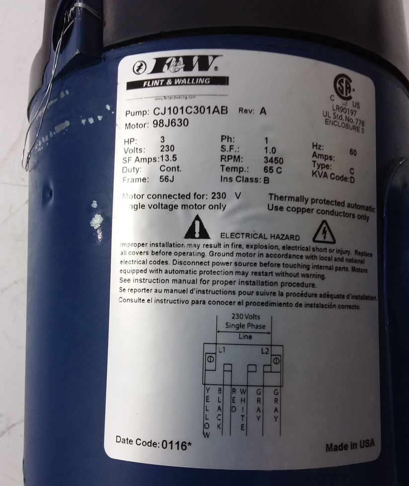 F & W Hp-3 Rpm-3450 Volts 230 Frame 56J Ph-1 CJ101C301AB