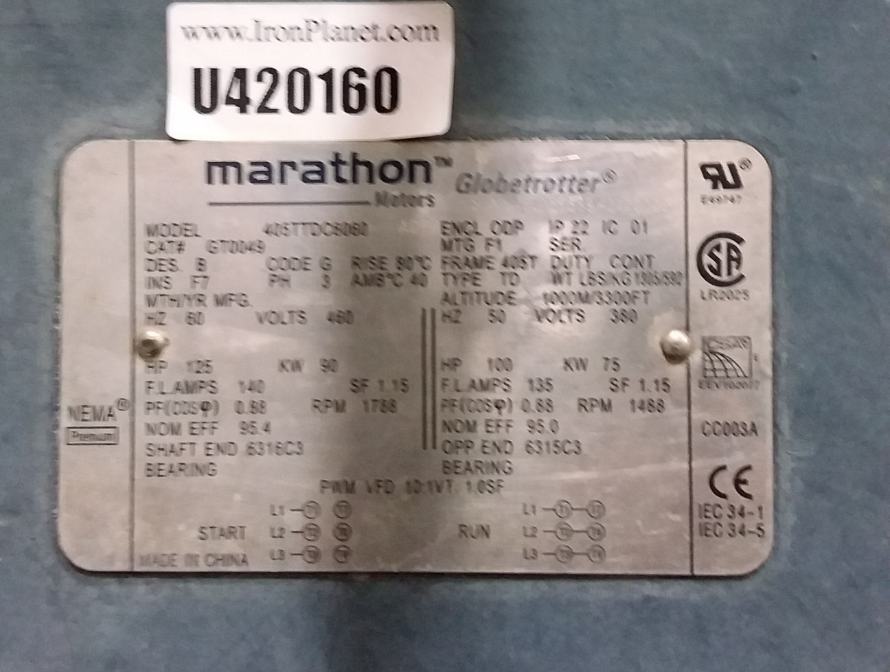 Marathon Motor Cat# GT0049 HP 100 RPM 1788 Frame 405T Volts 460